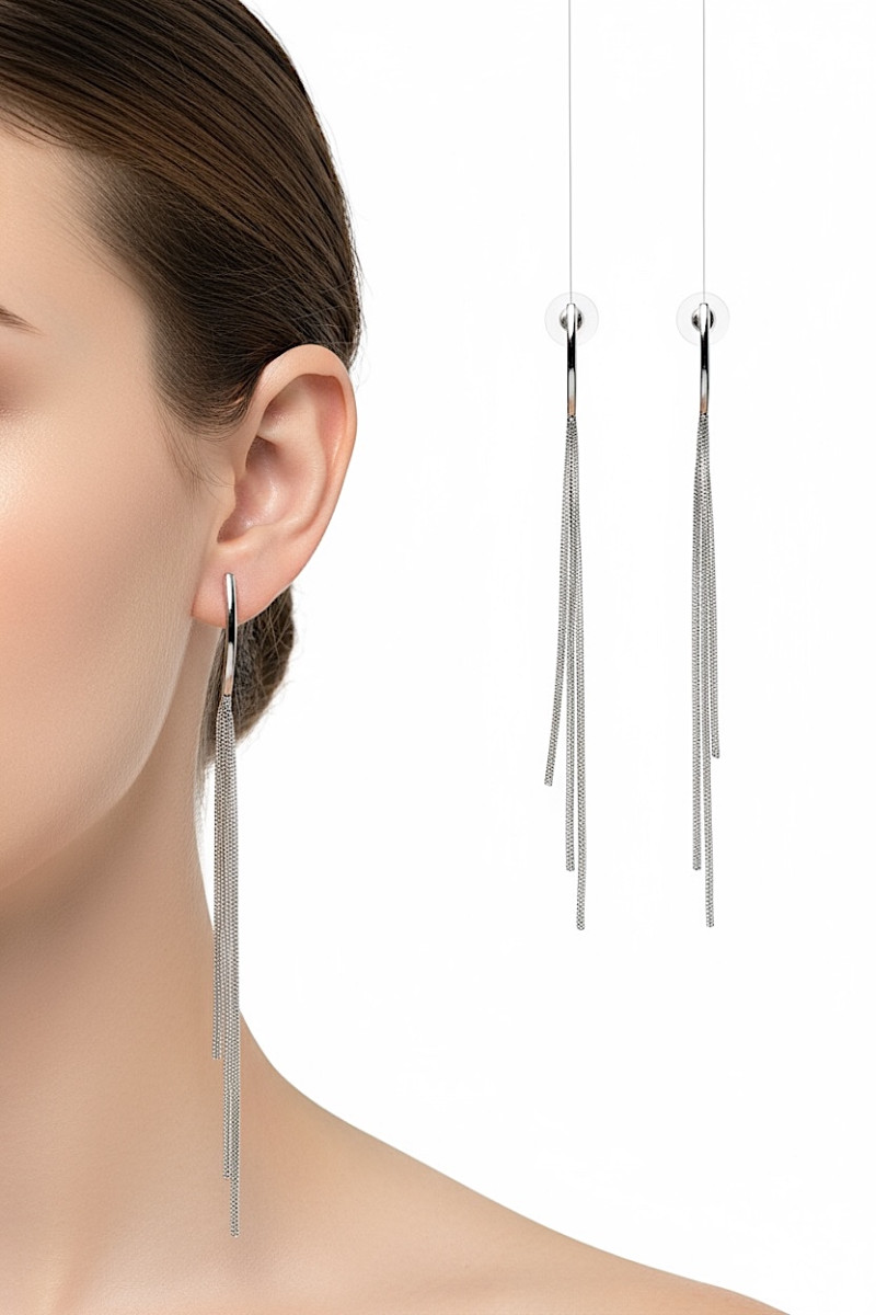 Елегантні сережки‑ланцюжки створюють витончений і сучасний акцент в образі. Гладка металева основа у сріблястому тоні поєднується з тонкими підвісками‑ланцюжками, що красиво рухаються під час ходи та додають образу легкості. Подовжений силует візуально витягує лінію шиї та підкреслює витонченість рис обличчя. Мінімалістичний дизайн робить прикрасу універсальною — вона гармонійно доповнює як повсякденні, так і вечірні образи. Легка конструкція забезпечує комфорт навіть при тривалому носінні.