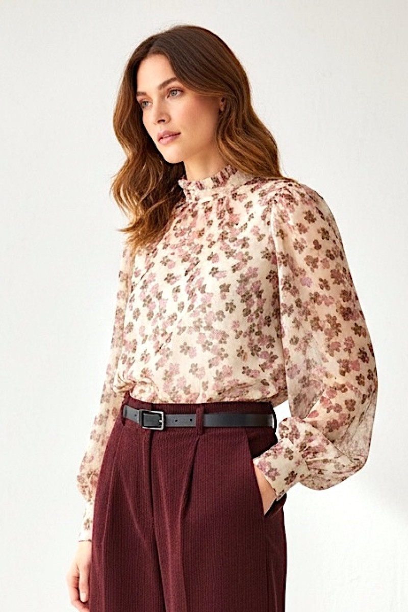 Изящная блуза из вискозы — романтичная модель, подчёркивающая женственность и лёгкость образа. Полупрозрачная мягкая ткань красиво струится и приятна к телу. Деликатный цветочный принт в пудрово‑розовых оттенках создаёт нежный и элегантный вид. Высокий воротник добавляет утончённости, а декоративный бант сзади служит стильным акцентом. Объёмные рукава с манжетами подчёркивают романтичный характер модели, а свободный силуэт обеспечивает комфортную посадку. Блуза прекрасно сочетается с классическими брюками, юбками и денимом.