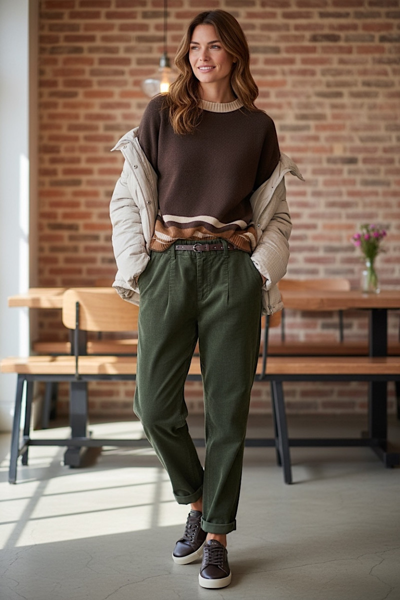 Элегантные брюки из микровельвета в стильном оливковом оттенке — практичная и универсальная модель для повседневного гардероба. Мягкая ткань приятна к телу, хорошо держит форму и обеспечивает комфорт в течение всего дня. Модель выполнена с удобной посадкой, аккуратным прямым силуэтом и функциональными карманами. Оливковый цвет легко сочетается с джемперами, свитерами, блузами и куртками — идеально подходит для casual и smart‑casual образов.