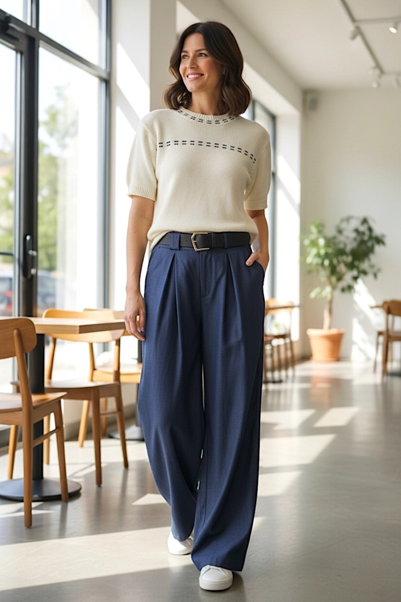 Элегантные брюки из вискозы сочетают комфорт, лёгкость и современный силуэт. Мягкая струящаяся ткань приятна к телу и красиво драпируется при движении. Модель выполнена в глубоком тёмно‑синем оттенке, который придаёт образу сдержанную элегантность и универсальность. Высокая посадка подчёркивает талию, а широкие штанины создают изящный силуэт и обеспечивают свободу движений. Эластичный пояс обеспечивает комфортную посадку, а декоративный ремень с пряжкой входит в комплект и служит стильным акцентом. Брюки отлично сочетаются с блузами, рубашками и жакетами, создавая как деловые, так и повседневные образы.