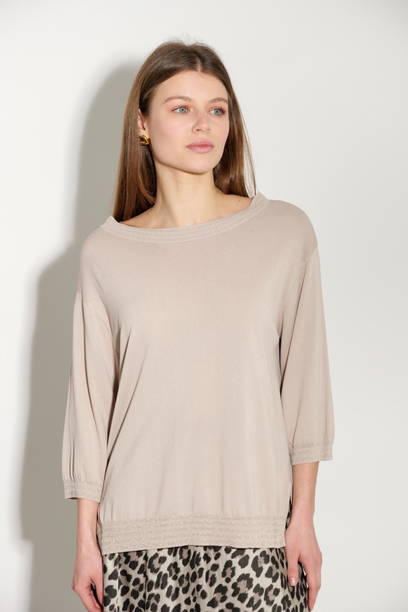 Удобный джемпер из вискозы с люрексом. Модель свободного кроя с элегантным вырезом "лодочка". Легкая текстура и блестящий эффект придают образу утончённости. Идеальный выбор для стильного повседневного или праздничного образа. Состав: 70% вискоза, 30% полиестер