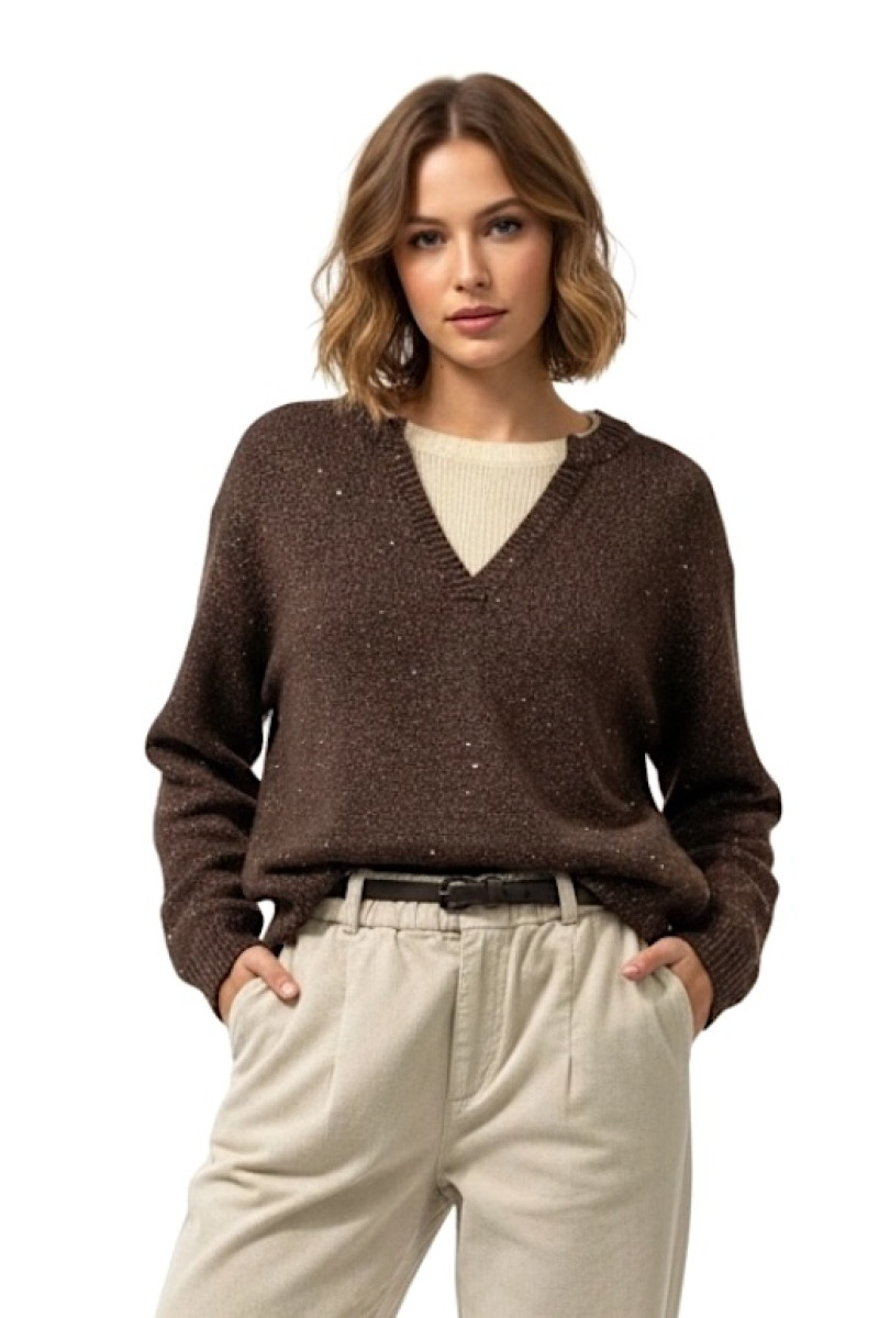 Элегантный джемпер из 100% мериносовой шерсти — сочетание природного тепла, комфорта и современного минимализма. Мериносовая шерсть отличается исключительной мягкостью и способностью поддерживать комфортную температуру тела. Материал нежный, дышащий и очень приятный к коже, не вызывает раздражения и обеспечивает комфорт в течение всего дня. Свободный силуэт с мягкой линией плеч создаёт расслабленный современный образ, а V‑образный вырез добавляет лёгкости. Глубокий шоколадно‑коричневый оттенок выглядит благородно и легко сочетается с базовым гардеробом.