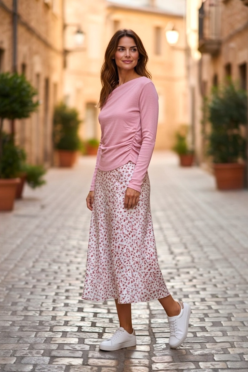 Лёгкая юбка из вискозы — идеальный выбор для создания нежных и женственных образов. Мягкая струящаяся ткань приятна к телу и красиво движется при ходьбе. Модель выполнена в светлом оттенке с деликатным цветочным принтом в розово‑красных тонах, который придаёт образу романтичность и свежесть. Свободный крой обеспечивает комфорт и лёгкость, а длина миди делает силуэт элегантным и универсальным. Юбка прекрасно сочетается с базовыми топами, трикотажем или рубашками, создавая стильные повседневные и более нарядные образы.