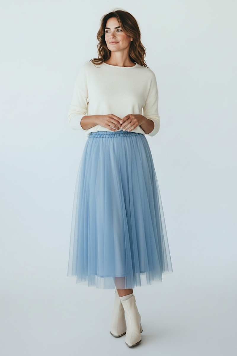 Эффектная макси‑юбка из фатина создаёт лёгкий воздушный силуэт и придаёт образу нежность и романтичность. Многослойный фатин красиво движется при ходьбе, формируя изящную динамику. Модель выполнена в деликатном нежно‑голубом цвете, который подчёркивает женственность и добавляет образу свежести. Эластичный пояс обеспечивает комфортную посадку и удобство в течение дня. Юбка отлично сочетается как с базовыми топами и футболками, так и с элегантными блузами для создания праздничных образов.
