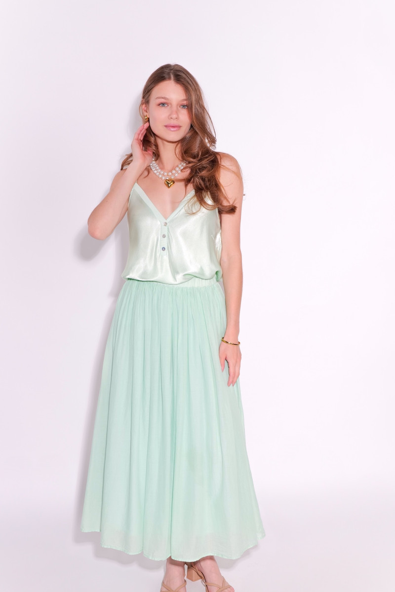 Летняя хлопковая юбка миди мятного цвета. Лёгкая и дышащая ткань подарит вам комфорт в жаркую погоду. Простой крой и свежий цвет делают эту модель идеальной для повседневных летних образов. Состав: 100% хлопок.