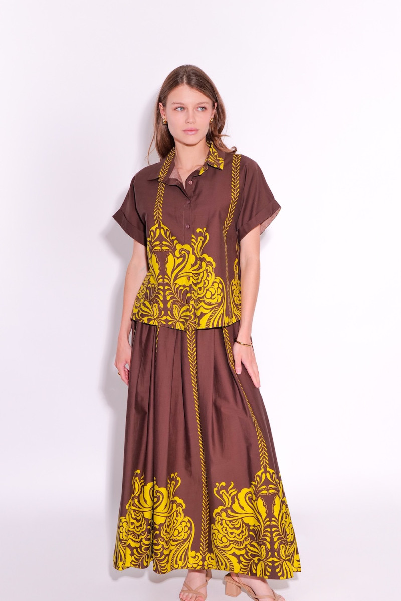 Коричневый летний костюм - это идеальный выбор для женщин, которые ценят комфорт и стиль в своем гардеробе. Его прекрасно подобранная юбка и блузка создают стильный образ, а удобная резинка на талии обеспечивает комфортное ношение на протяжении всего дня. Узор на юбке и блузке добавляет еще больше элегантности и очарования этому костюму, делая его идеальным выбором для различных мероприятий и событий этого лета. Состав: 100% хлопок