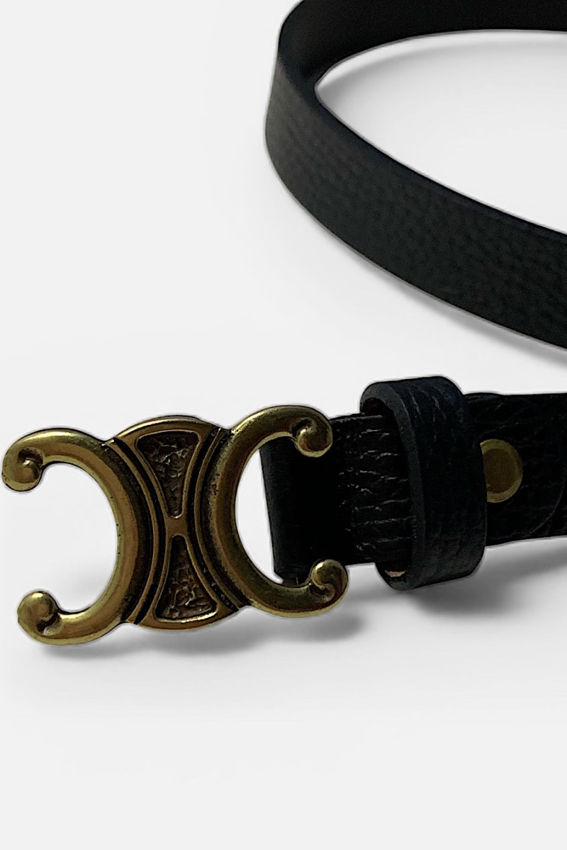 Стильный кожаный ремень с элегантной золотой пряжкой — аксессуар, который легко дополняет любой образ и виглядит дорого и утончённо. Выполнен из качественной гладкой кожи, подходит как к платьям, жакетам и пальто, так и к брюкам и джинсам. Благодаря регулируемой длине комфортно садится на размеры S, M и L.