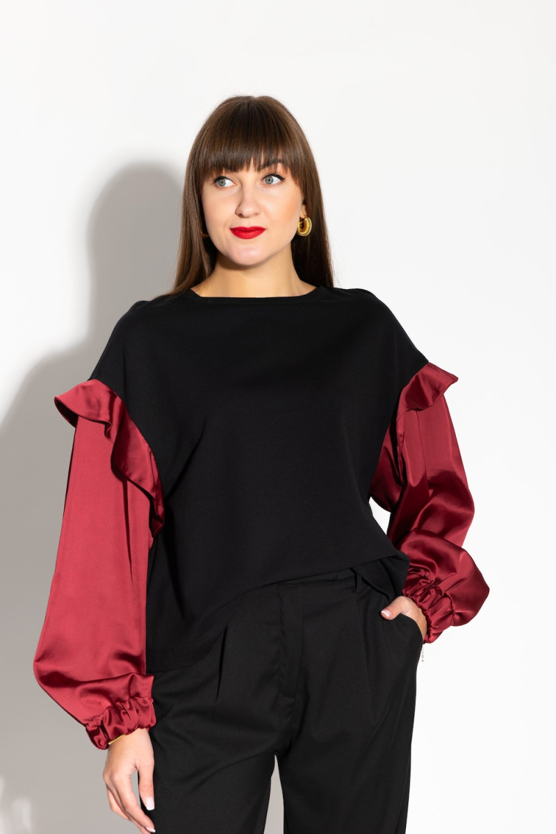 Женский свитшот черного цвета с контрастными рукавами. Основная часть изделия выполнена из трикотажной ткани, а рукава — из сатиновой ткани бордового цвета с рюшами на плечах. Рукава имеют объемный крой и собраны на резинку в манжетах. Свитшот выглядит стильно и элегантно, идеально подходит как для повседневной носки, так и для более официальных случаев. Состав: 95% хлопок, 5% еластан.