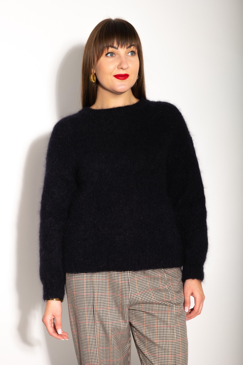 Чёрный свитер с кид-мохером, который придаёт ему мягкость и пушистость. Модель имеет прямой крой и простой дизайн, что делает его универсальным элементом гардероба. Мягкая текстура кид-мохера дарит ощущение тепла и уюта, идеально подходит для прохладных дней. Лаконичный и элегантный выбор для любого образа. Универсальный размер. ОГ - 104см. ОТ - 192см. Длина - 60см. Длина рукава - 63см. Состав: 76% кид мохер, 12% лана, 12% полиамид.