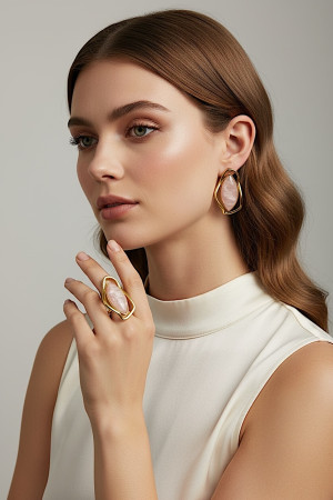 Элегантный комплект украшений, состоящий из серёг и кольца, станет эффектным акцентом в любом образе. Изящная золотистая оправа гармонично сочетается с декоративным камнем нежного розового цвета, создавая благородный и современный вид.