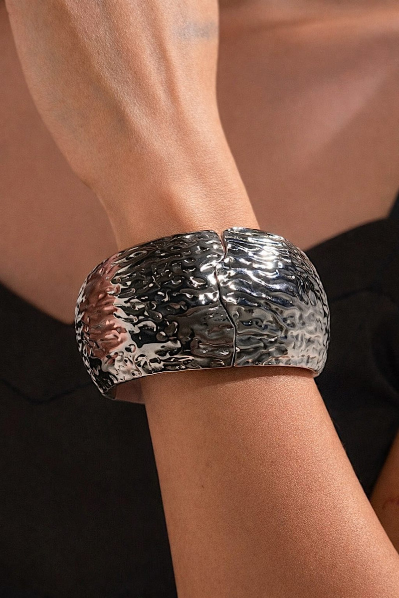 Эффектный металлический браслет — современное украшение, подчёркивающее индивидуальность и стиль. Широкая форма и выразительная рельефная фактура создают скульптурный вид и делают аксессуар заметным акцентом образа. Глянцевая поверхность красиво отражает свет, добавляя украшению глубину и благородный блеск. Открытая конструкция обеспечивает удобное надевание и комфортную посадку на запястье. Браслет идеально дополняет как минималистичные повседневные образы, так и элегантные вечерние луки.