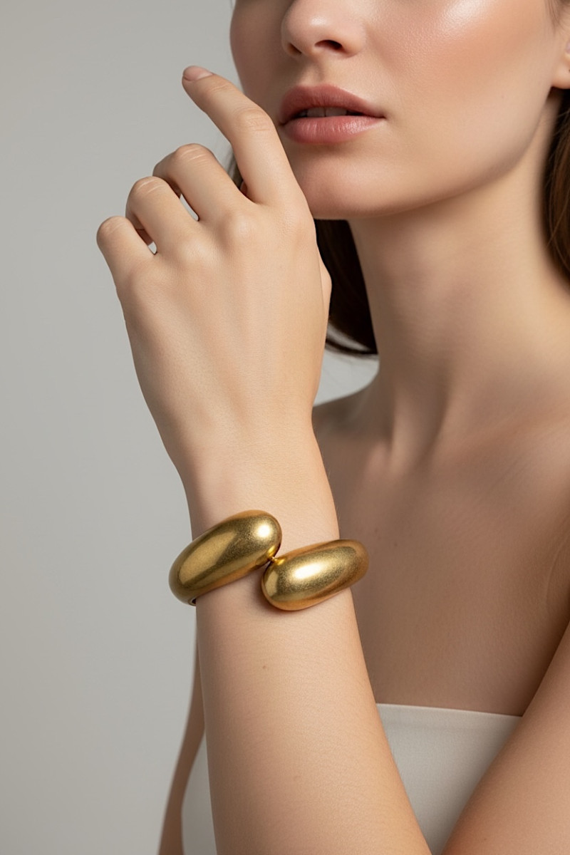 Эффектный металлический браслет с выразительной скульптурной формой — стильный акцент современного образа. Массивный дизайн с плавными округлыми линиями создаёт художественный силуэт и подчёркивает индивидуальность. Гладкая металлическая поверхность с благородным золотым блеском красиво отражает свет, придавая украшению глубину и элегантность. Открытая конструкция обеспечивает удобство надевания и комфортную посадку на запястье. Браслет гармонично дополнит как минималистичные повседневные образы, так и стильные вечерние луки.