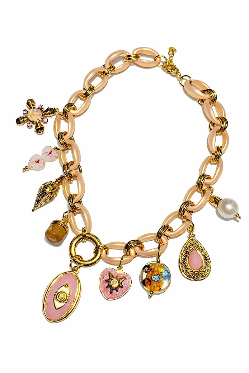 Эффектное украшение на шею с декоративными подвесками создаёт яркий и стильный акцент в образе. Сочетание глянцевого металла золотистого оттенка с нежными розовыми элементами придаёт украшению женственность и современный характер. Крупные звенья формируют трендовый силуэт, а разнообразные подвески — сердце, жемчужина, декоративные медальоны и художественные элементы — добавляют украшению индивидуальности и игривого настроения. Регулируемая застёжка позволяет удобно подогнать браслет по запястью. Украшение прекрасно дополнит как повседневные, так и праздничные образы. Цвет: розовый, золотистый Материал: металл, декоративные вставки, жемчуг