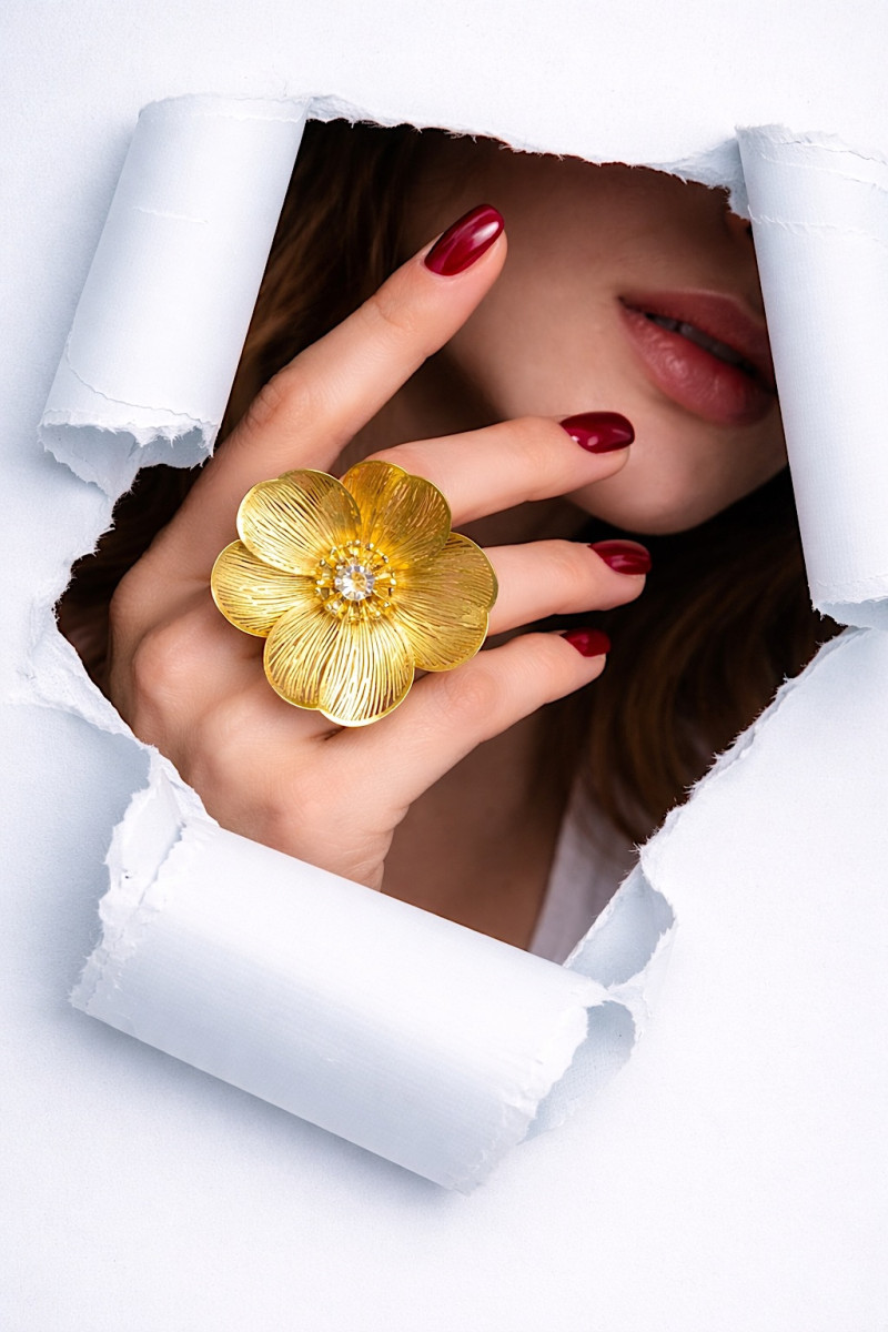 Эффектное дизайнерское кольцо в форме цветка — акцент, который сразу притягивает взгляды. Золотистое покрытие и сияющий кристалл в центре создают роскошный образ и подчёркивают женственность.